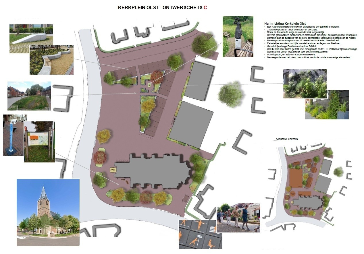 De gemeente had al op de planning staan om de riolering en het groen op het kerkplein te vervangen. Enkele betrokken inwoners zagen dit als een uitgelezen kans om het plein ook aantrekkelijker te maken en te vergroenen. De nodige overleggen tussen de gemeente, de initiatiefgroep, gebruikers en omwonenden van het kerkplein volgden. Alles is in kaart gebracht, waarna drie ontwerpschetsen zijn gemaakt. Hier kon iedereen op reageren en zijn/haar voorkeur aangeven. Dat is massaal gedaan. De betrokkenheid is groot. De voorkeur ging uit naar ontwerp A.