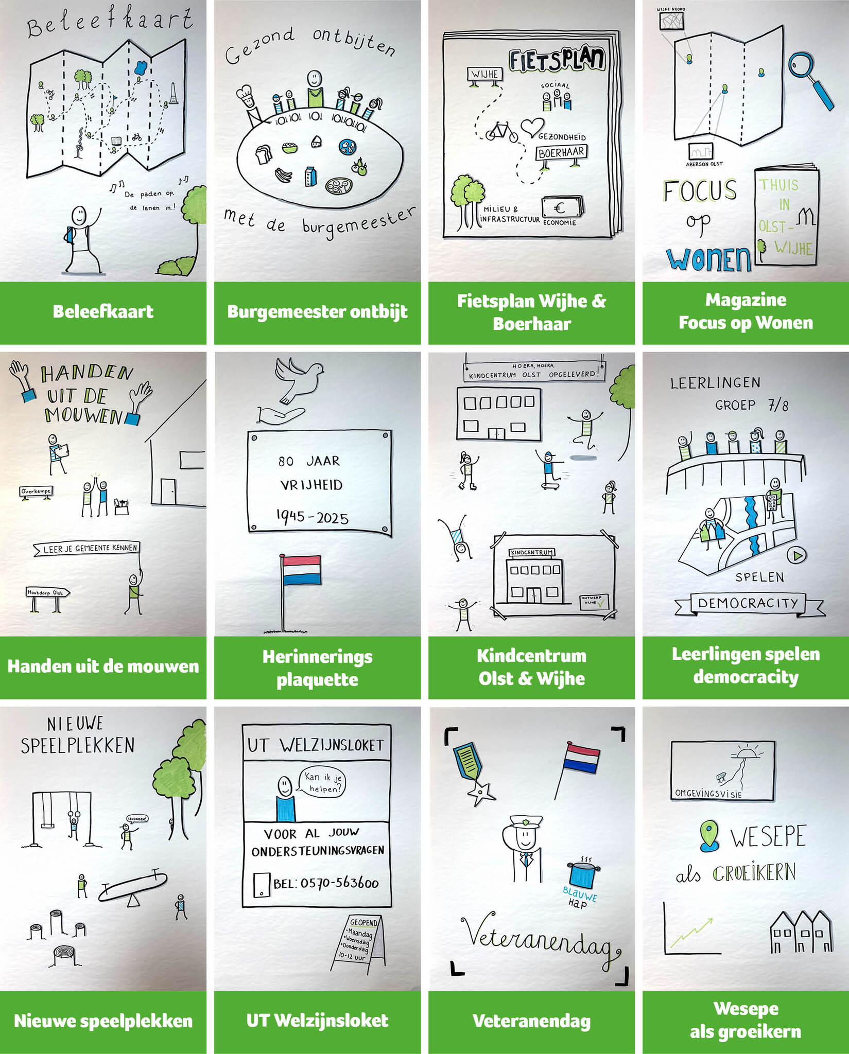 Hieronder ziet u 12 unieke illustraties van Irene From-Bakker. Zij heeft 12 belangrijke mijlpalen en gebeurtenissen van het afgelopen jaar in beeld gebracht. Samen vormen ze een aansprekende terugblik op het jaar 2025 van de gemeente Olst-Wijhe.
