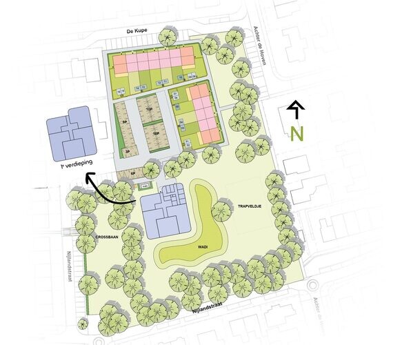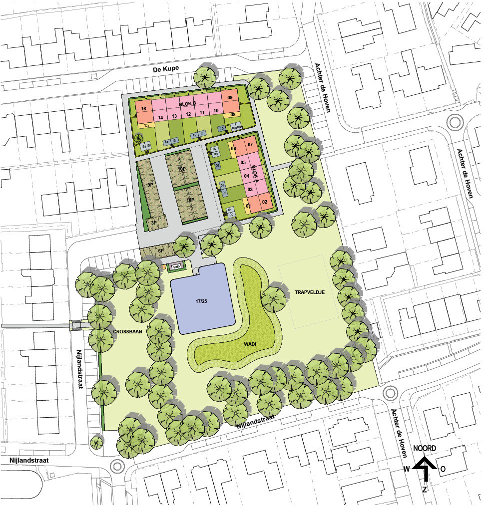 Er komt een mix van 8 eengezinswoningen, 8 beneden-/bovenwoningen en 9 appartementen. De appartementen komen op een deel van het grasveld en de eengezins- en beneden-/bovenwoningen komen op de plek van de school.