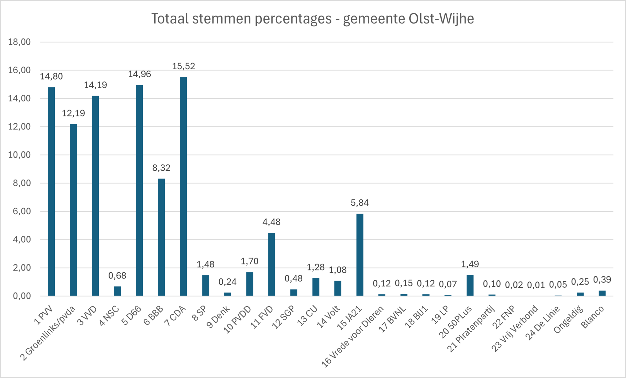 Na de sluiting van de stembureaus is er geteld op lijstniveau. Hieronder vindt u een overzicht van de voorlopige uitslag in de gemeente Olst-Wijhe. In totaal hebben er 12940 stemgerechtigden gestemd in onze gemeente, dit is een opkomstpercentage van 85,21%